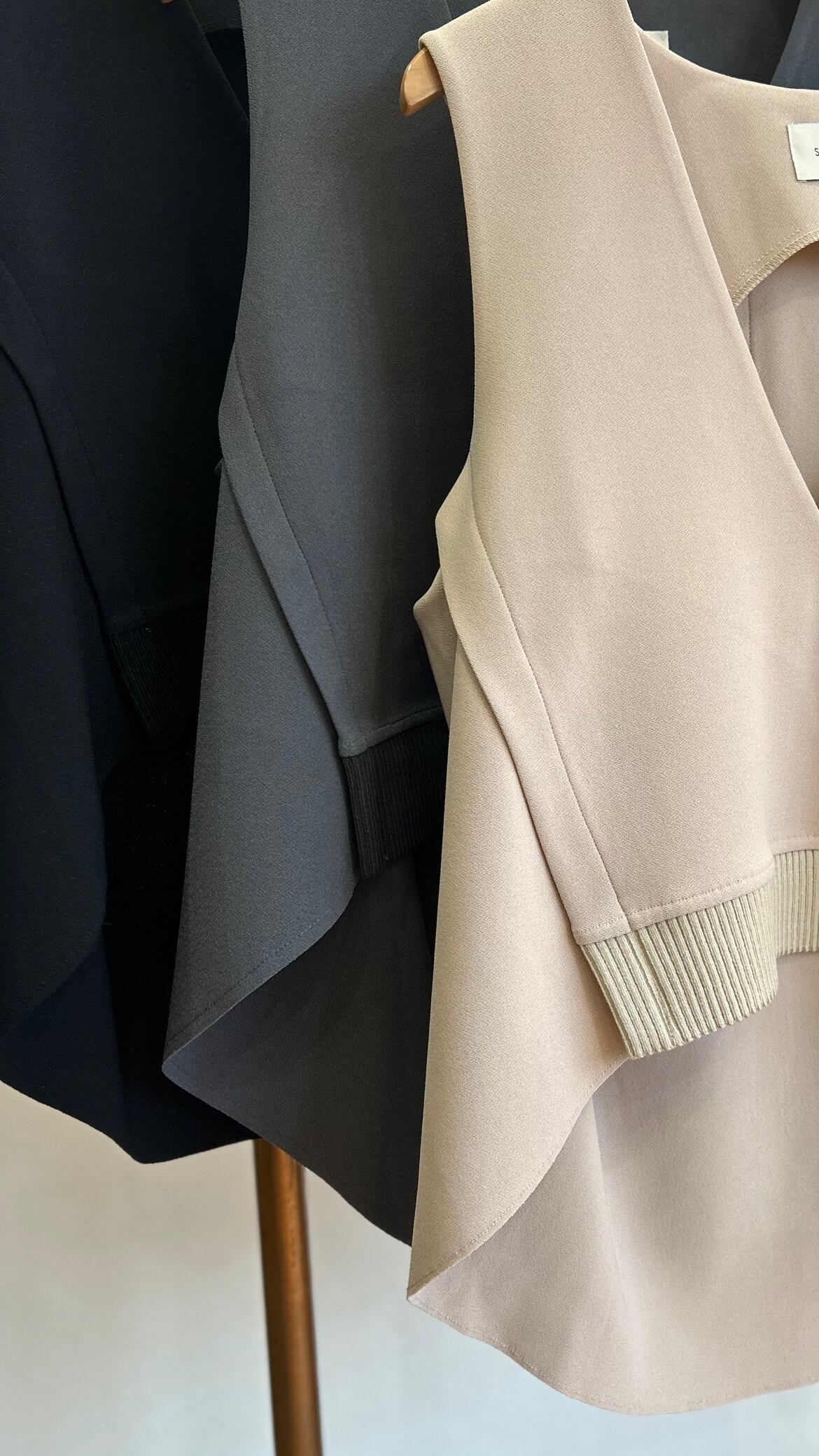後ろはヒップが隠れる長さで、スカートでもパンツでもバランスよく決まる一枚