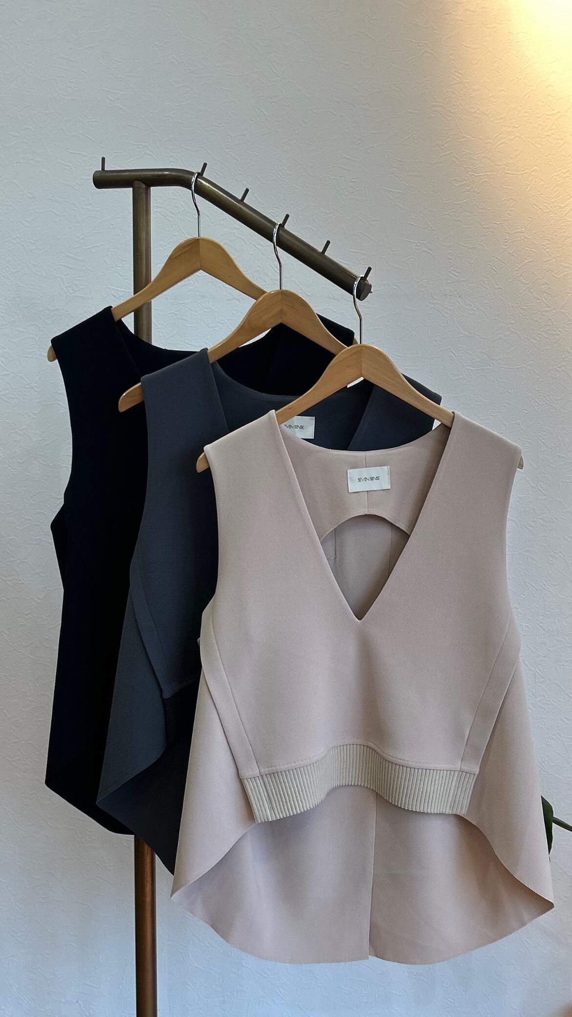 ネックはシャツなど重ね着もしやすい深Vネック、裾は前後差のある抜け感のあるデザイン。
