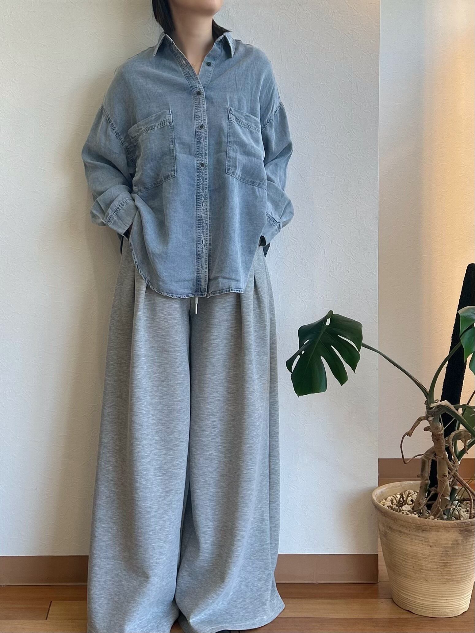 柔らかい素材なので、オーバーサイズでも着やせして見え、スウェットやニットの中に重ね着してもご着用いただけます。